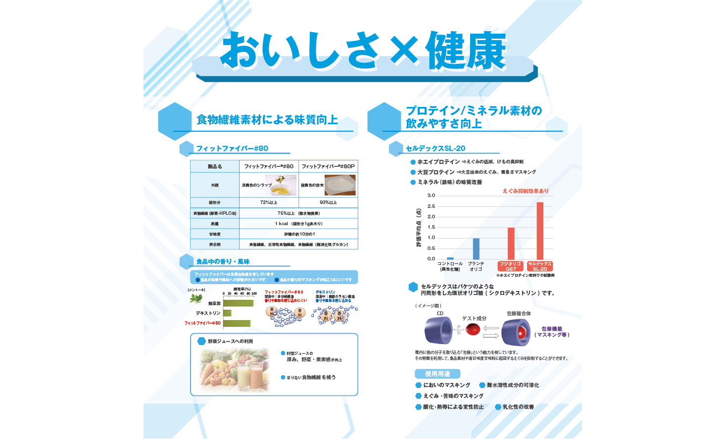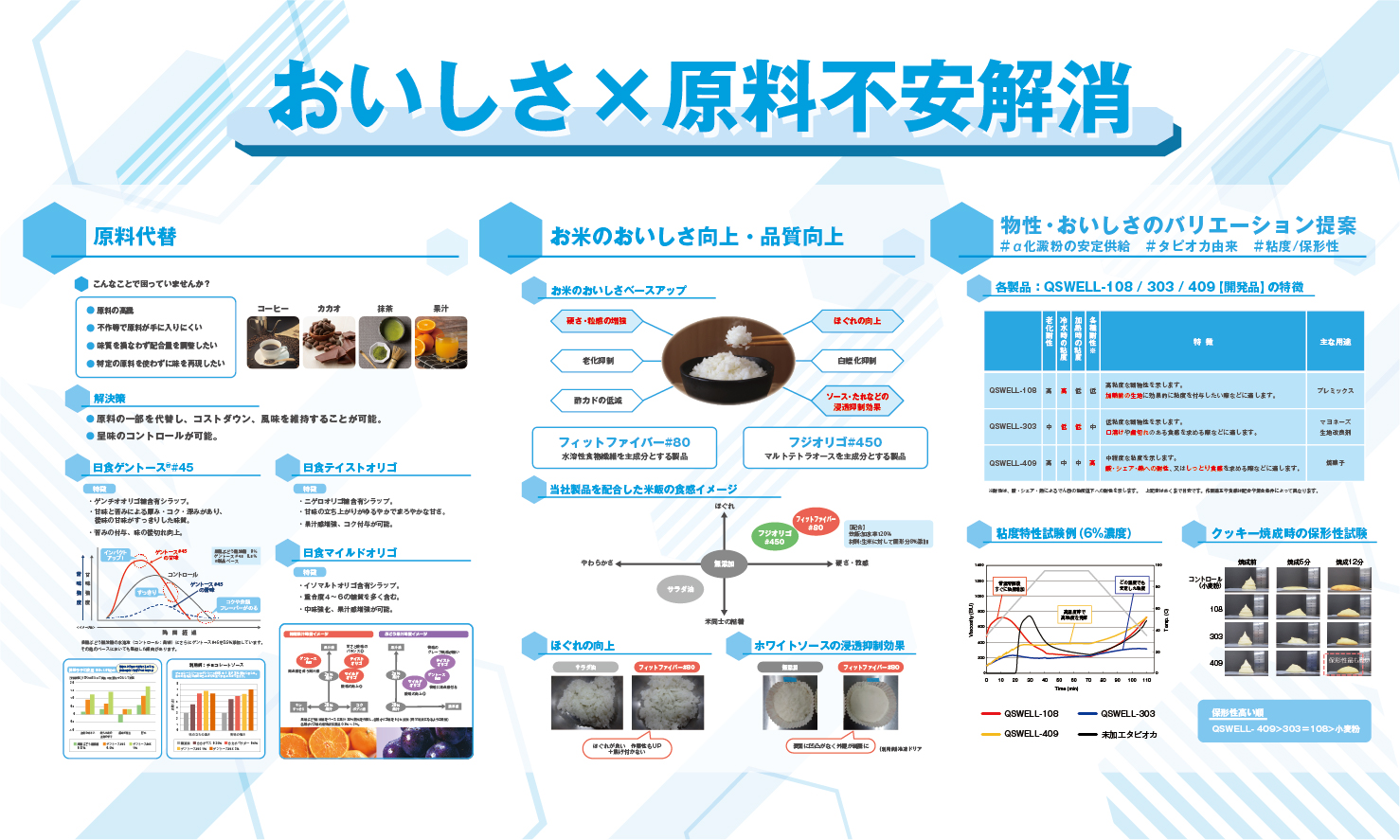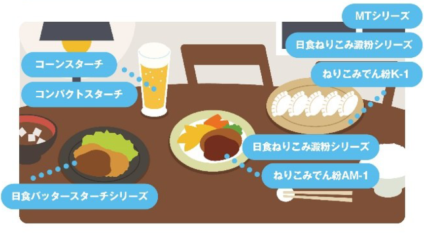 食品開発展2025 東京ビックサイト 西1ホール 1-0632025年10月15日(水)〜17日(金)10:00〜17:00 展示内容Contents 詳しく見る 味質改良 中味向上に最適なオリゴ糖 日食マイルドオリゴ 主成分:α-1,6結合分岐オリゴ糖(重合度4-6の糖質を高含有) 味質:風味を損なわず自然でマイルドな味質(甘味度約25%) 詳しく見る 味質改良 苦みのあるオリゴ糖 日食ゲントース#45 糖質には珍しいキレの良い苦味を有するゲンチオオリゴ糖を含むグルコオリゴ糖です。苦味付与効果のほか、隠し味として用いることで果汁感増強効果や渋味低減効果などを有します。 詳しく見る 食感改良 陳列、レンジ加熱後もサクサクに! 日食テクスターチ#01 揚げ物衣の食感改良を目的としたタピオカ加工でん粉です。 常温陳列時やレンジ加熱後も良好な食感を維持します。 衣の食感をサクサクとしたひきのない食感にします。 詳しく見る ここにもある!日本食品化工 日本食品化工の製品は日々の食卓で活躍しています。 お問い合わせ