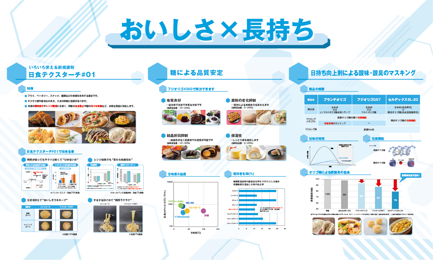 食品開発展2025 東京ビックサイト 西1ホール 1-0632025年10月15日(水)〜17日(金)10:00〜17:00 展示内容Contents 詳しく見る 味質改良 中味向上に最適なオリゴ糖 日食マイルドオリゴ 主成分:α-1,6結合分岐オリゴ糖(重合度4-6の糖質を高含有) 味質:風味を損なわず自然でマイルドな味質(甘味度約25%) 詳しく見る 味質改良 苦みのあるオリゴ糖 日食ゲントース#45 糖質には珍しいキレの良い苦味を有するゲンチオオリゴ糖を含むグルコオリゴ糖です。苦味付与効果のほか、隠し味として用いることで果汁感増強効果や渋味低減効果などを有します。 詳しく見る 食感改良 陳列、レンジ加熱後もサクサクに! 日食テクスターチ#01 揚げ物衣の食感改良を目的としたタピオカ加工でん粉です。 常温陳列時やレンジ加熱後も良好な食感を維持します。 衣の食感をサクサクとしたひきのない食感にします。 詳しく見る ここにもある!日本食品化工 日本食品化工の製品は日々の食卓で活躍しています。 お問い合わせ